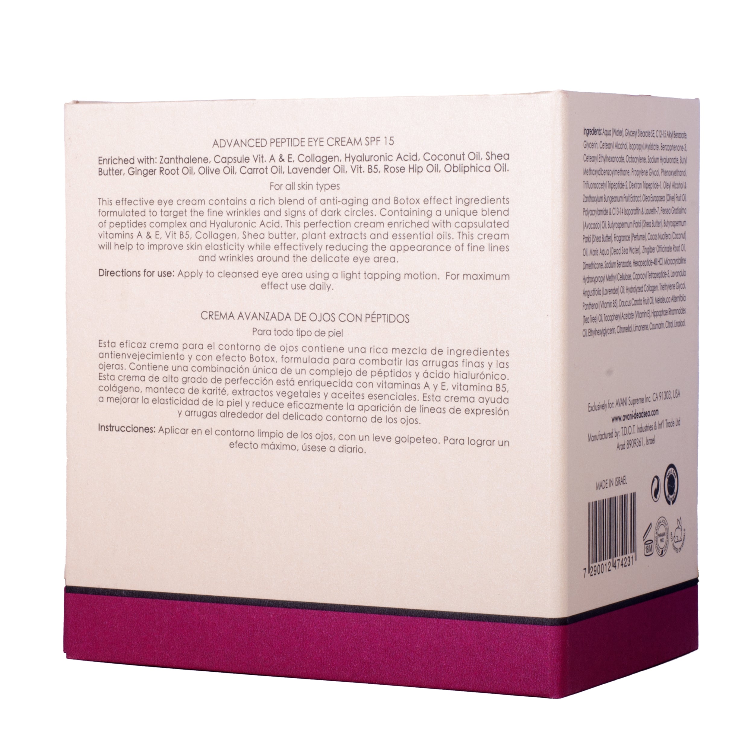 This effective eye cream contains a rich blend of anti-aging and Botox effect ingredients formulated to target the fine wrinkles and signs of dark circles. Containing a unique blend of peptides complex and Hyaluronic Acid. This perfection cream enriched with capsulated vitamins A & E, Vit B5, Collagen, Shea butter, plant extracts and essential oils. This cream will help to improve skin elasticity while effectively reducing the appearance of fine lines and wrinkles around the delicate eye area.