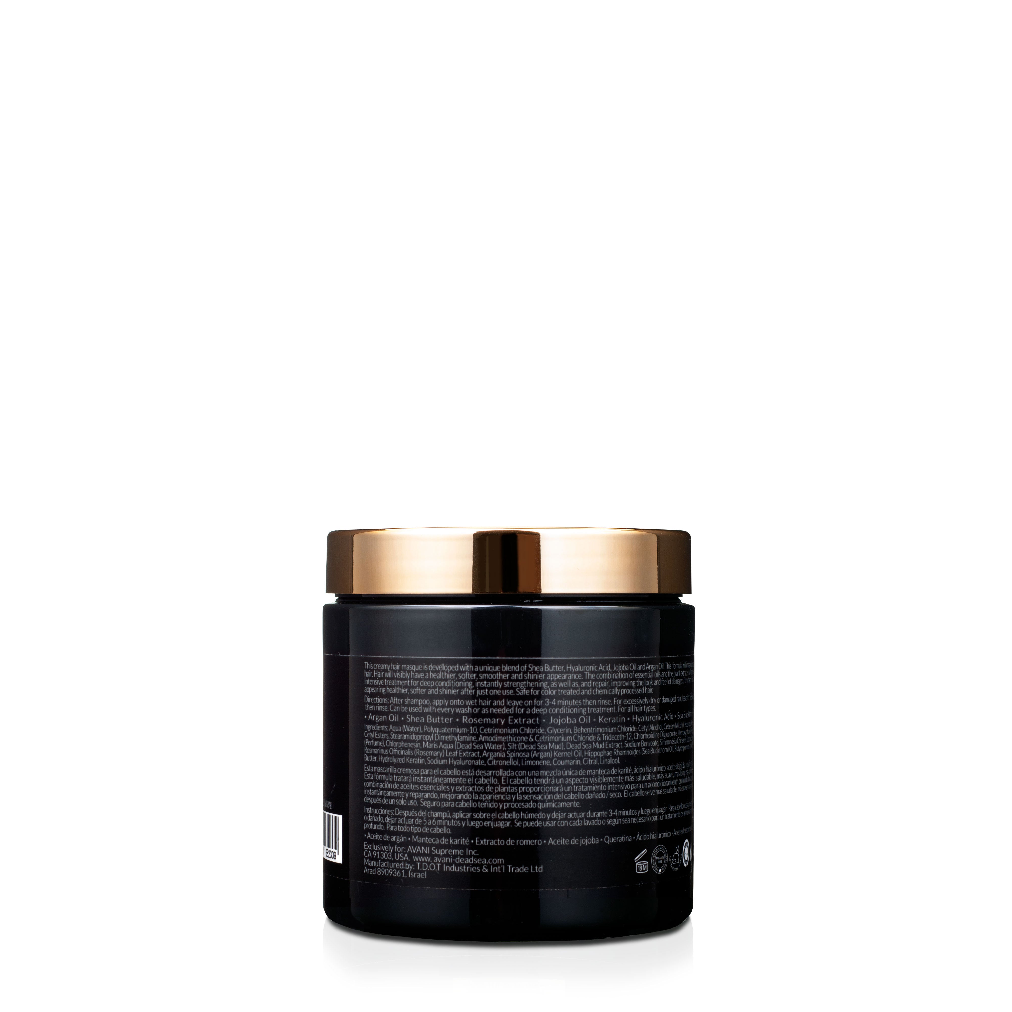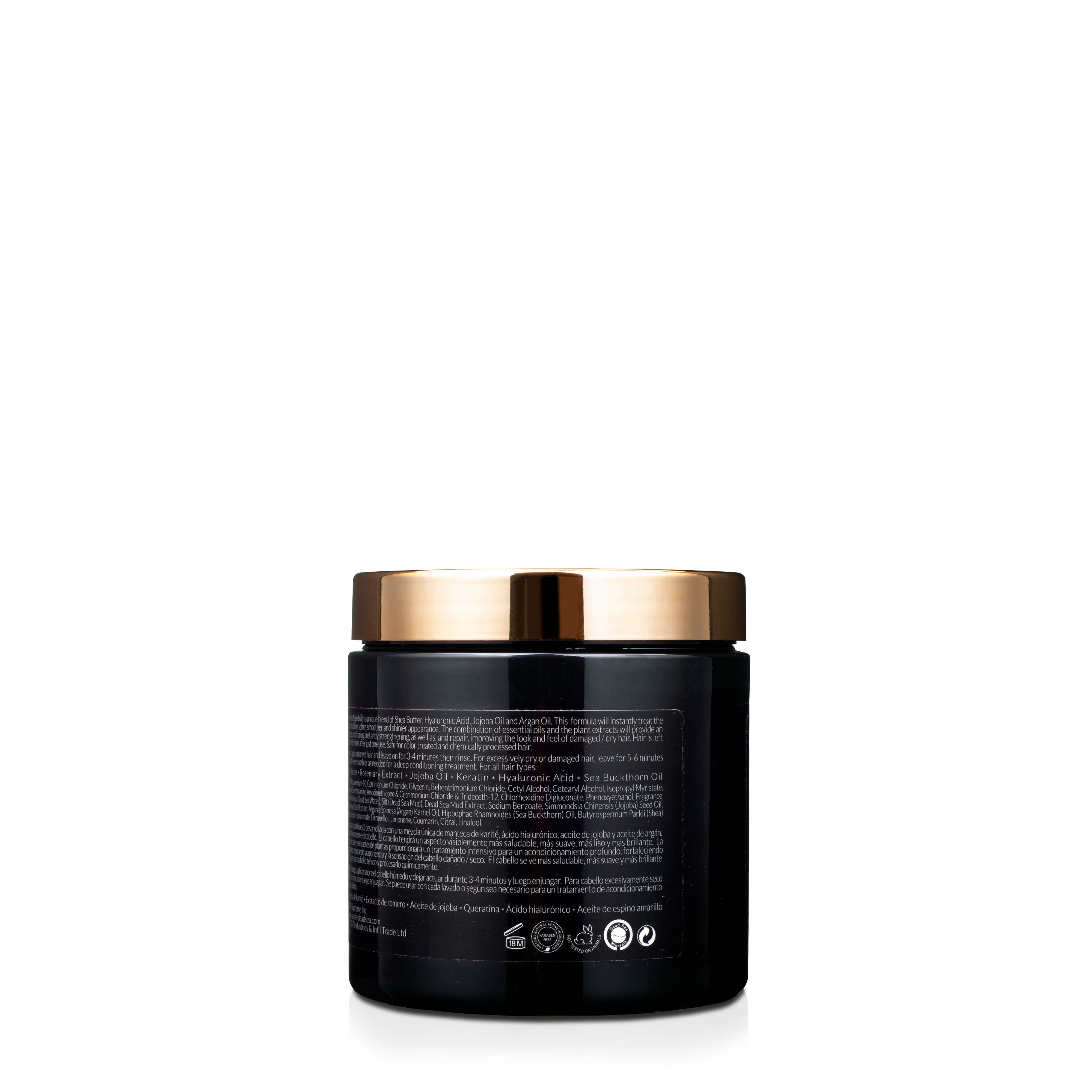 This creamy hair masque is developed with a unique blend of Shea Butter, Hyaluronic Acid, Jojoba Oil and Argan Oil. This formula will instantly treat the hair. Hair will visibly have a healthier, softer, smoother and shinier appearance. The combination of essential oils and the plant extracts will provide an intensive treatment for deep conditioning, instantly strengthening, as well as, and repair, improving the look and feel of damaged / dry hair. Hair is left appearing healthier, softer and shinier after just one use. Safe for color treated and chemically processed hair.